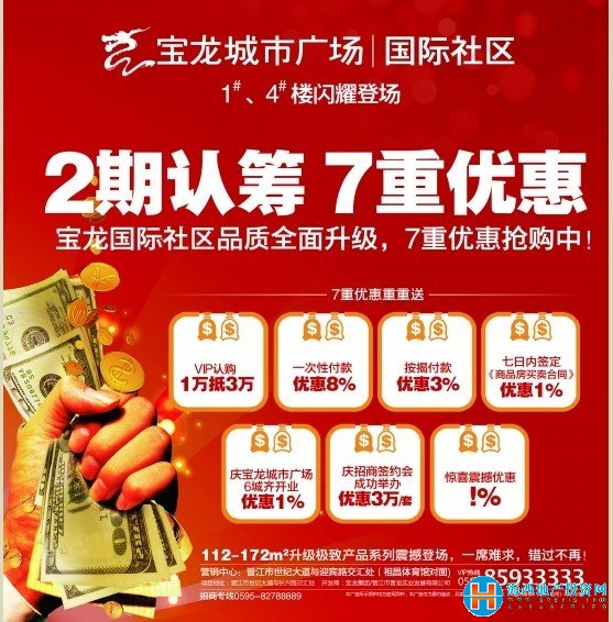 (海西地产投资网11月10日报道)宝龙城市广场国际社区1号楼和4号楼日前接受认筹,本次房源为112-172平米户型,7重优惠重重送出:1、VIP认购1万抵3万;2、一次性付款优惠8%;3、按揭付款优惠3%;4、7日内签订《商品房买卖合同》优惠1%;5、庆宝龙城市广场6城齐开业优惠1%;6、庆招商签约会成功举办优惠3万/套;7、惊喜震撼优惠。