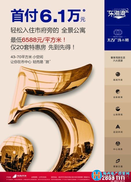 (海西地产投资网12月15日报道)日前,东海湾太古广场二期5号楼推出20套特惠房,首付6.1万元起,而起价仅6588元/平。户型为43-70平米全景公寓,有兴趣的网友可致电详询。