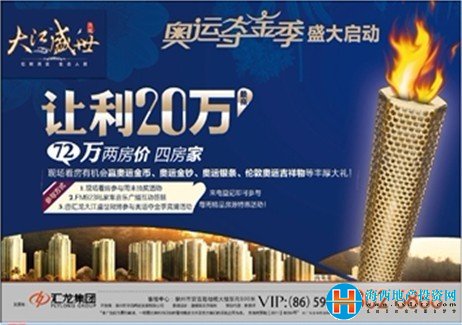 (海西地产投资网7月18日报道)汇龙大江盛世奥运夺金季目前盛大启动,现场看房有机会赢奥运金币、奥运金钞、奥运银条、伦敦奥运吉祥物等丰厚大礼!活动期间,购房可获得最高让利20万的优惠,70万两房的价就可以买到四房的家。
