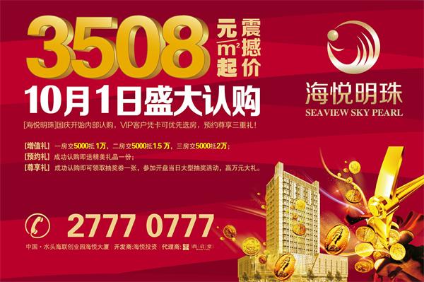 海西地产网9月26日消息:海悦明珠,震憾价3508元/㎡起,存5千抵2万,10月1日起正式内部认购!38~137㎡全系臻品,商业、商住、商务,300%三项全能物业。