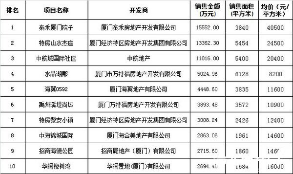 销量前三甲来自泰禾厦门院子,0.38万平方米、1.55亿元,特房山水杰座0.5万平方米、1.34亿元,中航城国际社区0.54万平方米、1.11亿元,前三甲均为较为高端的住宅项目。