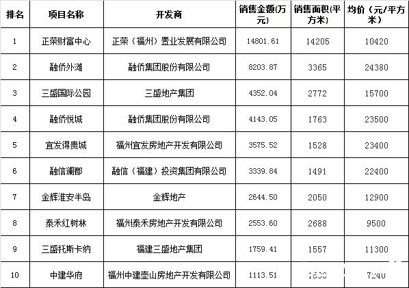 福州区域一周楼市成交排行