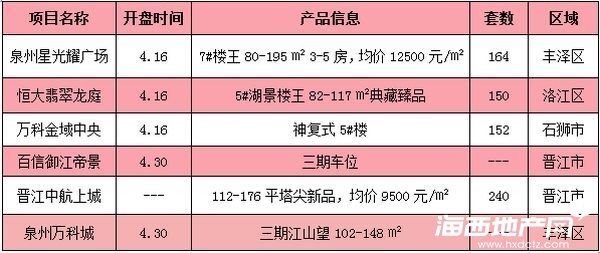 4月泉州有6个项目开盘,其中5个项目推住宅,1个项目推成为,经统计新推住宅房源超700套。这些项目多为片区内重点盘,且多为房企大咖项目。如恒大翡翠龙庭、泉州万科城、中航上城、万科金域中央。