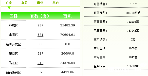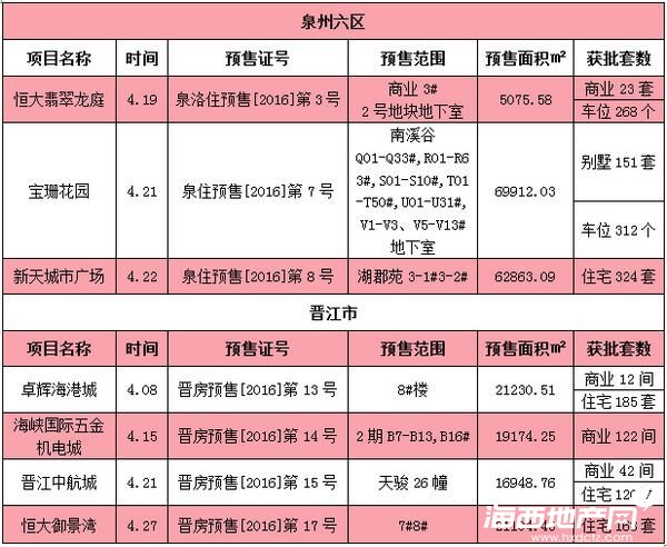 经统计,4月泉晋两地共有7个项目拿得预售许可证,共1727套房源,预售面积达216308.65㎡,其中住宅797套,别墅151套,住宅商业199套,车位580个。其中泉州市区3个项目,共1078套房源;晋江则有4个项目,仅649套房源。