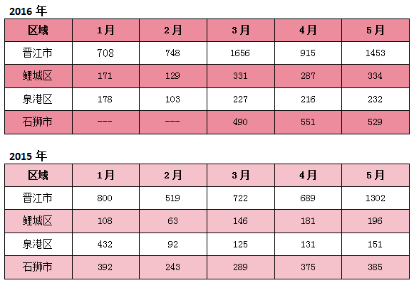 据海西地产网数据显示,晋江市2015年前五个月一手住宅成交总量4032套,而2016年前五个月一手住宅成交总量为5480套,同比上涨35.91%;鲤城区2015年2月-5月一手住宅成交586套,而2016年2月-5月成交1081套,同比增长84.47%;泉港区2015年4月-5月一手住宅成交282套,而2016年4月-5月成交448套,同比涨58.87%;石狮市2015年5月一手住宅成交385套,而2016年5月成交529套,同比上涨37.4%。