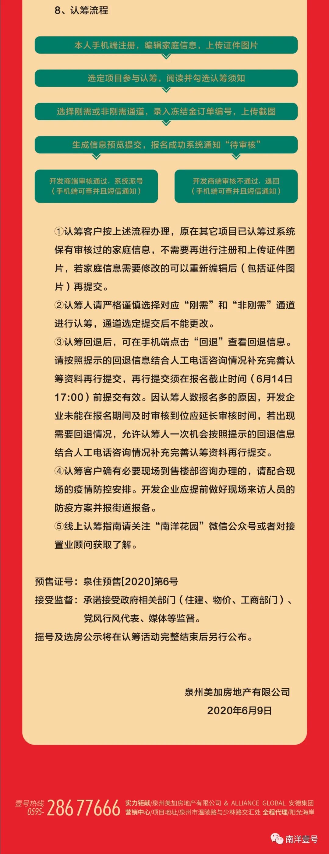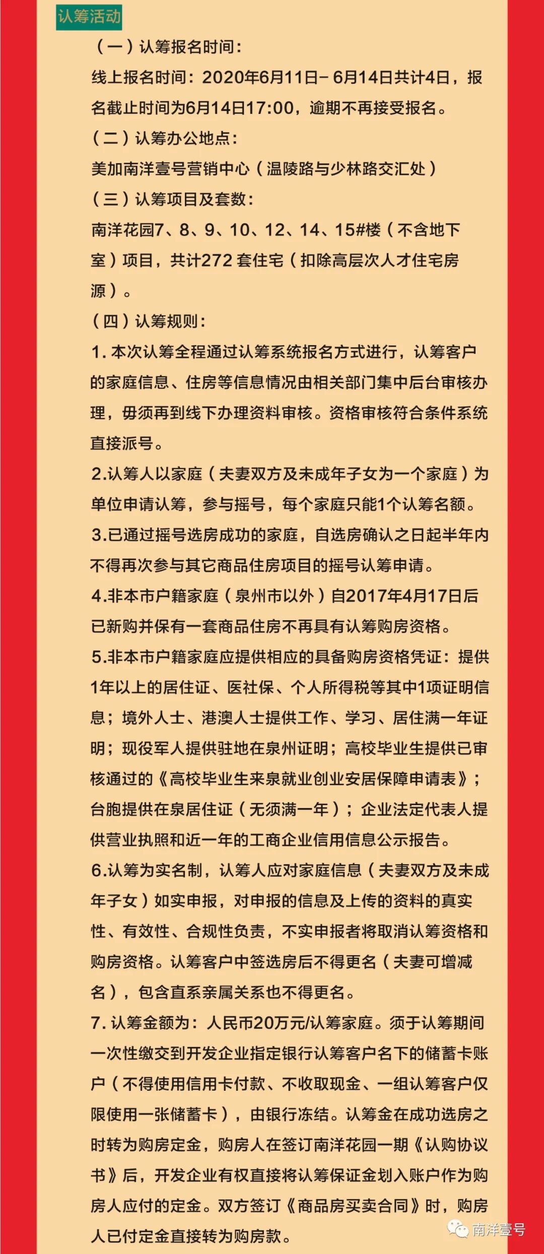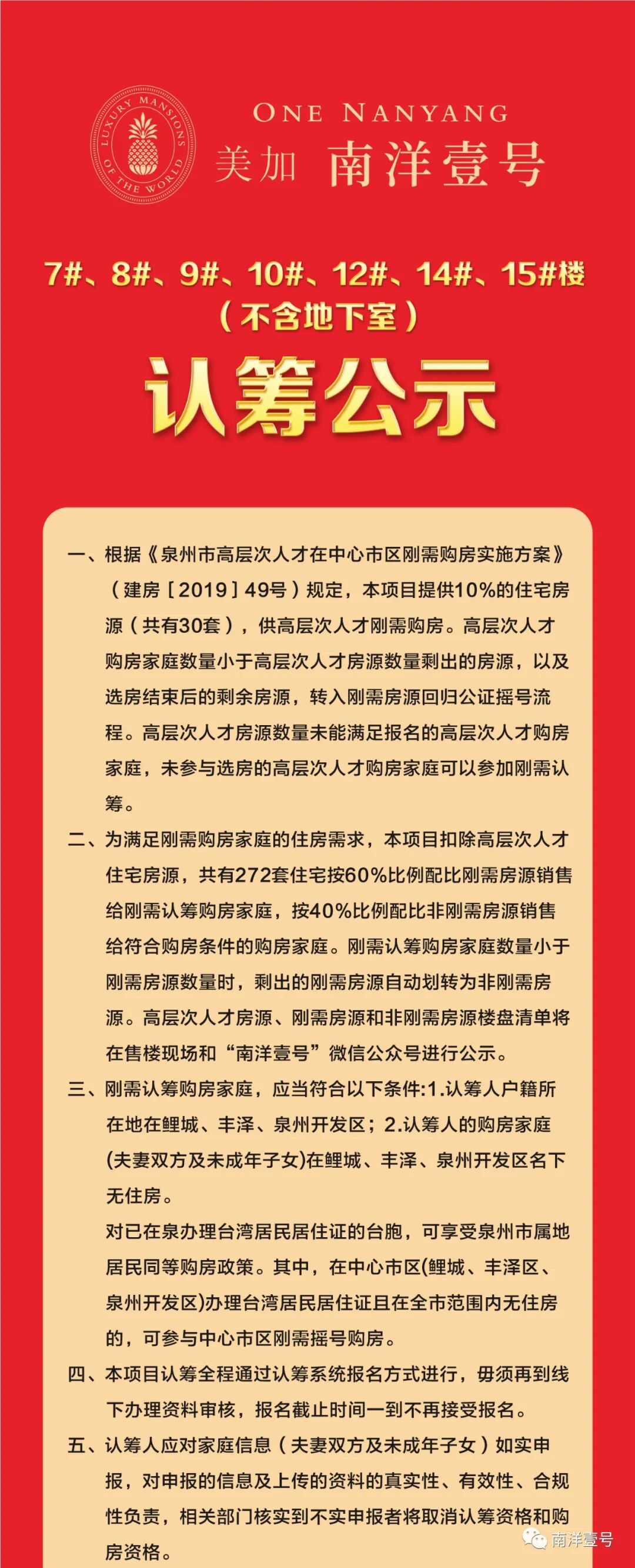 6月11-6月14日位于泉州市区少林路的美加南洋壹号7#、8#、9#、10#、12#、14#、15#楼共302套住宅将举行认筹活动,扣除30套高层次人才房源,共272套。