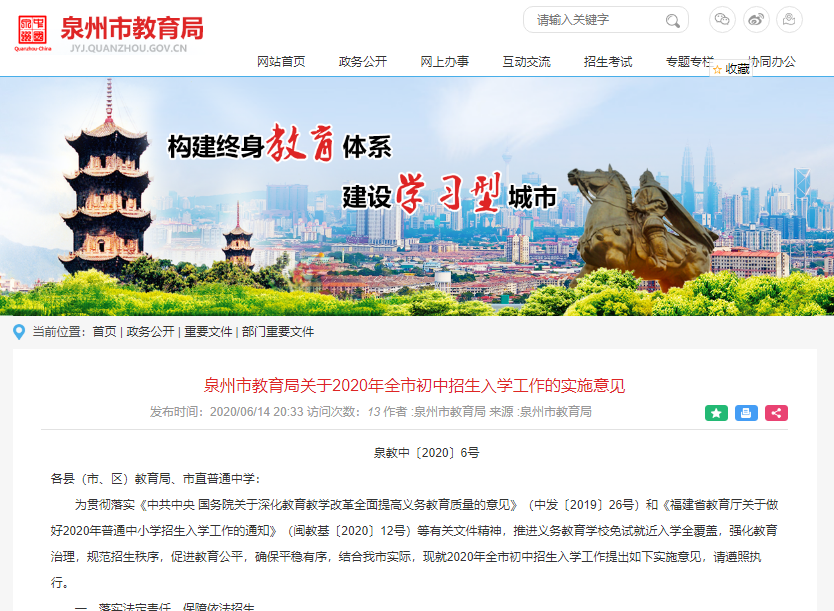 昨日,泉州市教育局印发《关于2020年全市初中招生入学工作的实施意见》(以下简称《实施意见》),确定2020年泉州市小升初公民同招、兼报,民办超额100%摇号!《实施意见》重点有哪些?具体如何规定?一起来看看吧!(点击左下角"阅读原文“查看详情)