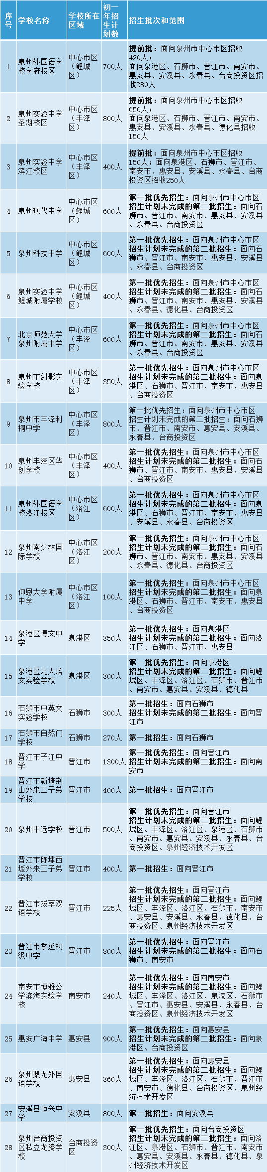 提前批:民办九年一贯制学校和十二年一贯制学校初中部面向其小学部招生。泉州实验中学圣湖校区、泉州实验中学滨江校区、泉州外国语学校学府校区按计划面向中心市区及中心市区以外的部分县(市、区)招生。〔设3个志愿;先按计划面向中心市区招生,再按计划面向中心市区以外的部分县(市、区)招生;若中心市区招生计划未完成,剩余计划数自动转入面向中心市区以外的部分县(市、区)招生〕。