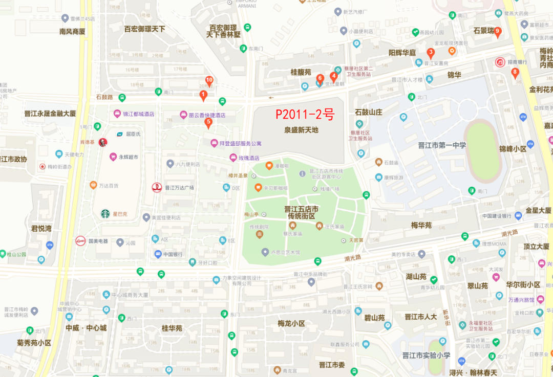 根据示意图可知,晋江市P2011-2号南侧即是晋江五店市,北侧为桂馥苑,东侧为晋江市第一中学,西侧为晋江万达广场,交通四通八达,周边配套完善,地理位置优越。