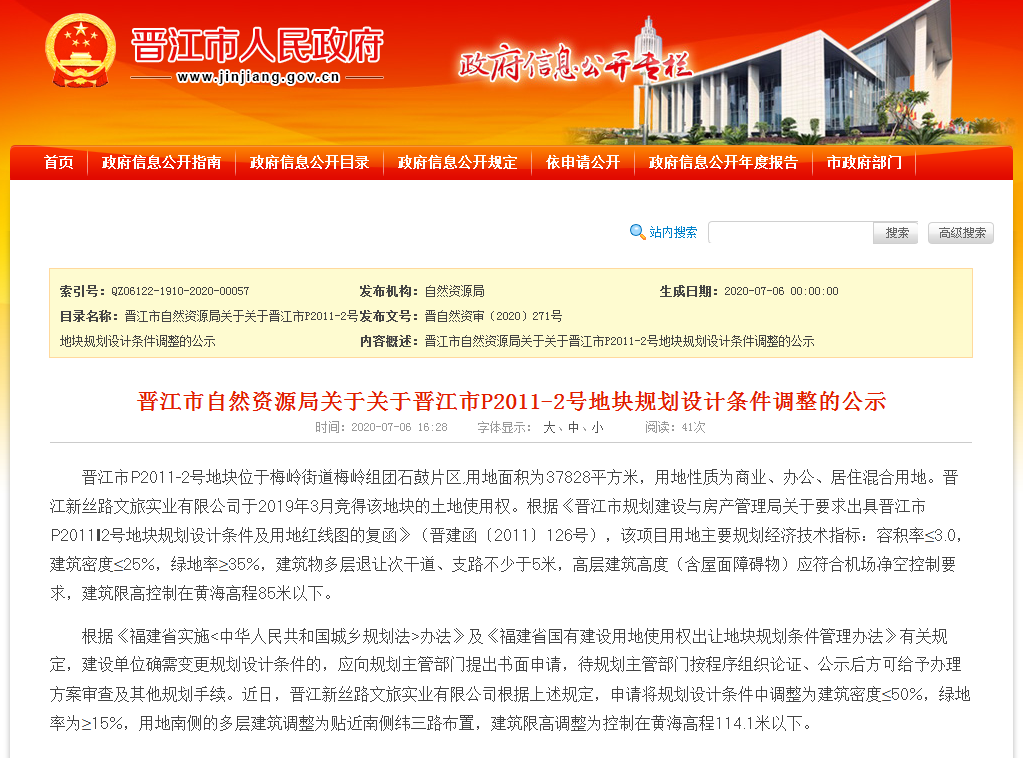 7月6日,晋江市人民政府网站发布了晋江市自然资源局关于关于晋江市P2011-2号地块规划设计条件调整的公示。