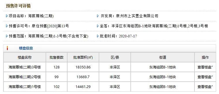 7月17日,根据泉州住建局网站显示海宸尊域(二期)1号楼、2号楼、3号楼获批预售,其中,住宅房源305套,预测价格区间9888-15970元/㎡,户型建面约105-190㎡的2-4房。