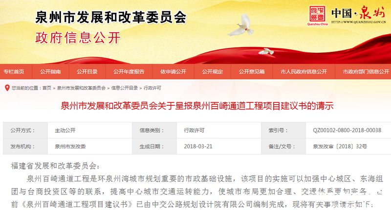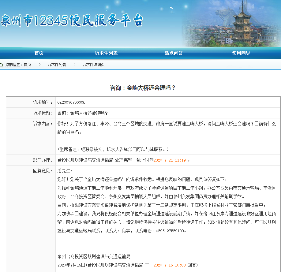近日,有网友在泉州市12345便民服务平台咨询到“金屿大桥还会建吗?”。对此,台投区规划建设与交通运输局作出了回复: