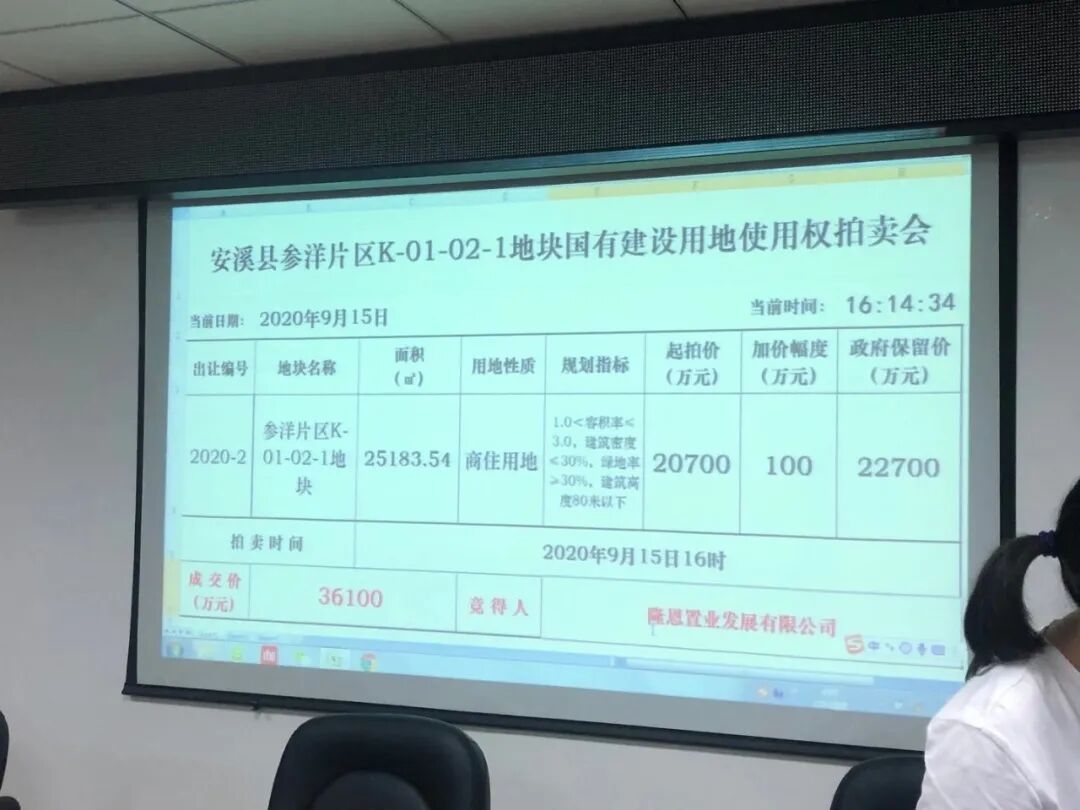 9月15日,安溪2020-2号地块成功出让,由隆恩&阳光城以3.61亿元竞得,楼面价约4779元/㎡,溢价率74.4%,住宅毛坯限价8898元/㎡。