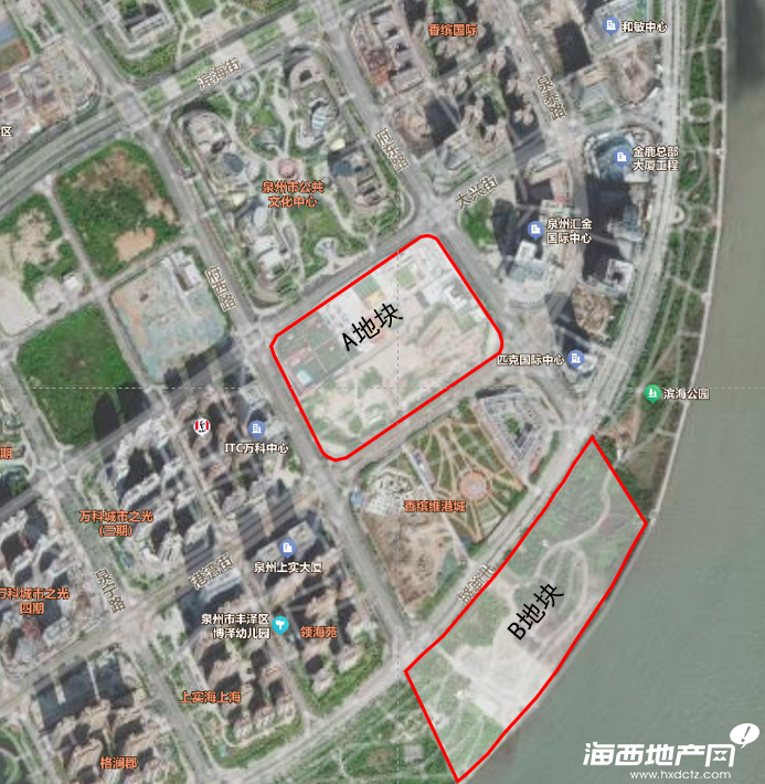 本项目基地位于泉州市东海行政中心商务轴,城市空间策划范围和建筑设计范围为A、B两地块,总面积为21.96公顷。A地块北至大兴街,南至港湾街,西至府西路,东至府东路,南北长约255米,东西长约391米,占地约9.57万平方米。B地块北至丰海路,南至泉州湾,西至府西路,东至府东路,南北长约204米,东西长约624米,占地面积约12.39万平方米。