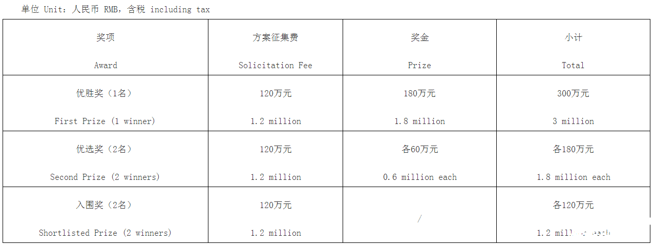 7.2入围应征人在最终方案评审会结束,并经方案评审委员会评定其方案符合《设计任务书》要求的,将各获得方案征集费人民币120万元,并根据所获奖项获得相应奖金。若获得优胜奖或优选奖的入围应征人成为承接本项目后续设计工作的单位,则奖金部分不再予以支付。