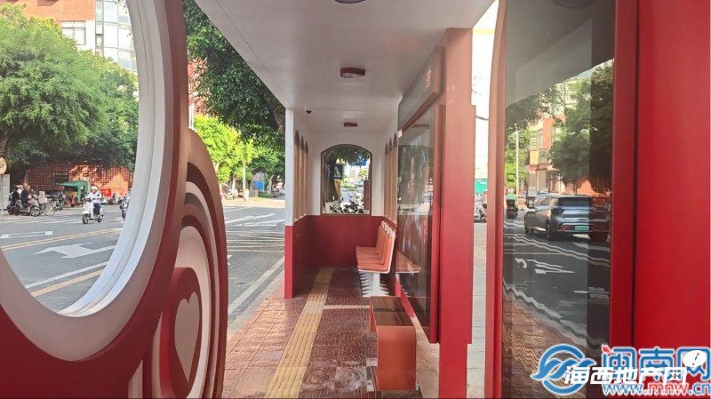 在幸福街口,铛铛车主题候车亭的设计灵感源自泉州公交铛铛车,其左侧候车室融入了铛铛车的造型元素,并结合“幸福”这一浪漫主题进行创意表达。候车亭右侧还特别设置爱心打卡窗口。在等待公交车的过程中,乘客可以站在打卡窗口前拍照留念,记录下自己在泉州街头的美好瞬间。