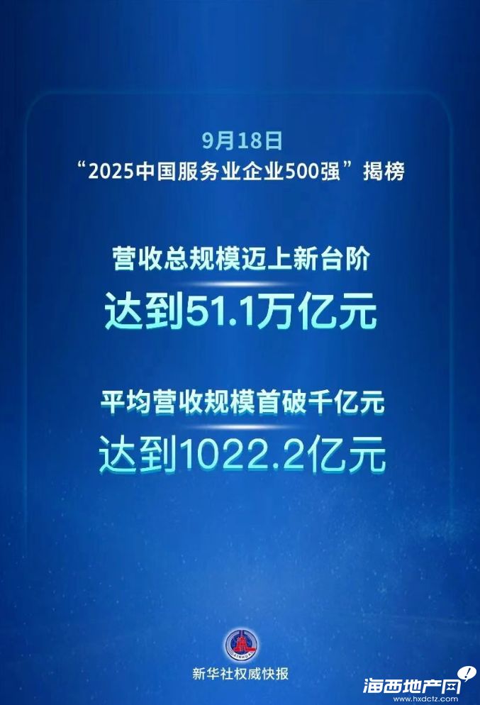 9月18日,中国企业联合会、中国企业家协会发布“2025中国服务业企业500强”榜单。福建省共有40家企业入围,其中泉州市4家企业成功上榜,分别为泉州发展集团有限公司、泉州城建集团有限公司、泉州交通发展集团有限责任公司和福建路港(集团)有限公司。数据显示,2025中国服务业企业500强营业收入总额突破50万亿元,达到51.1万亿元,增长3.82%,增速较上年提高1.9个百分点;平均营业收入规模首次突破千亿元,达到1022.2亿元;入围门槛达到79.8亿元,增长10.71%;资产总额突破400万亿元大关,达到404.9万亿元,增长9.19%。
