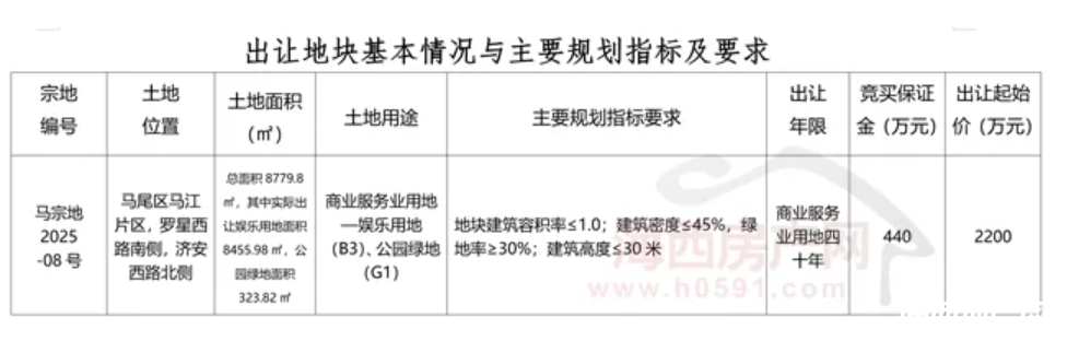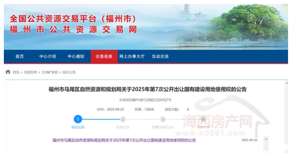 10月15日,福州市马尾区自然资源和规划局发布“关于2025年第7次公开出让国有建设用地使用权的公告(榕马资规让[2025]7号)”。