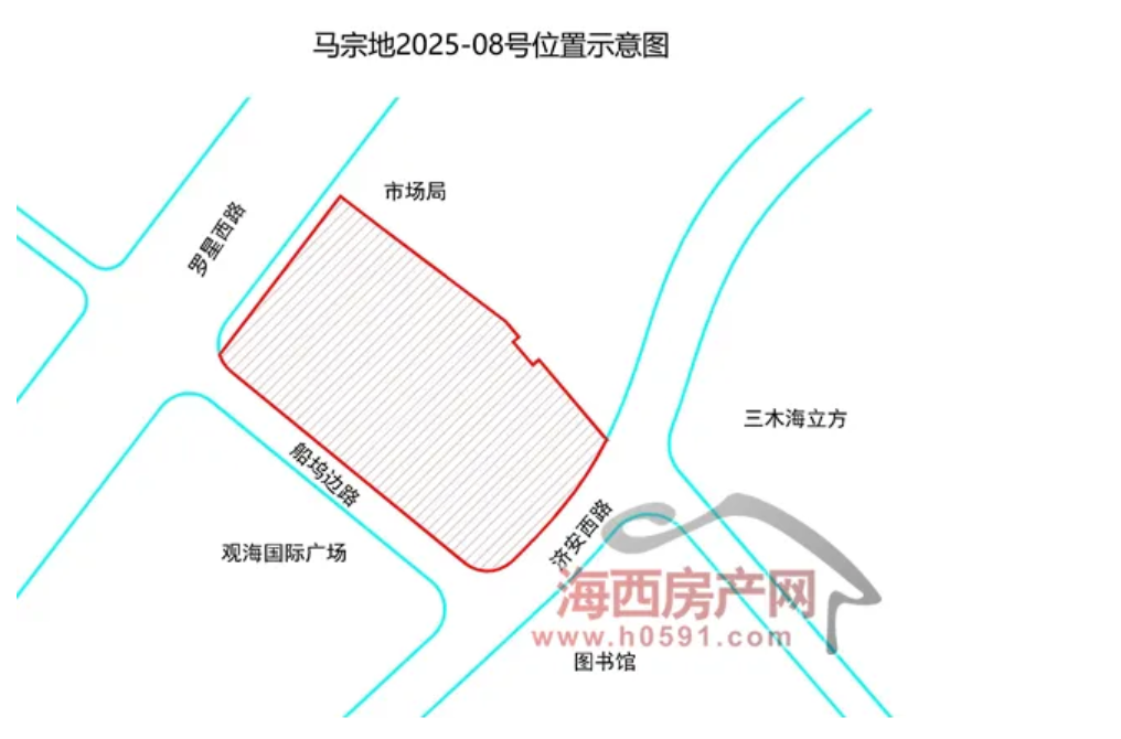 本次拍卖地块编号为马宗地2025-08号,地块位于马尾区马江片区,罗星西路南侧,济安西路北侧,土地用途为商业服务业用地—娱乐用地(B3)、公园绿地(G1)。