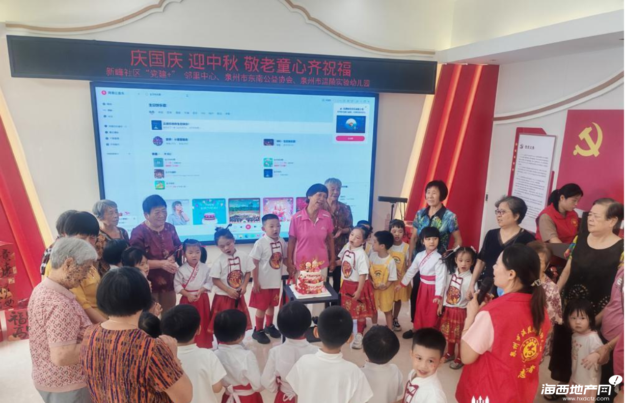 泉州网9月30日讯(融媒体记者高云 陈茗香 文/图)9月29日上午,在国庆与中秋双节来临之际,泉州市东南公益协会联合新峰社区、泉州市温陵实验幼儿园,在鲤城区鲤中街道新峰社区活动中心举办了一场别开生面的“童心伴银龄,共庆好时光”老幼同乐生日会。17名当月生日的老人与30名温陵实验幼儿园的孩子欢聚一堂,共度佳节。