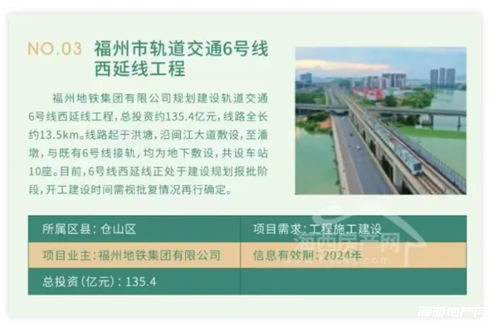 根据福州官方发布消息,福州地铁集团有限公司规划建设轨道交通6号线西延线工程,总投资约135.4亿元。