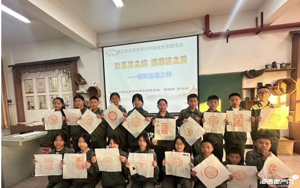 晋江市东石中学的学生在“瓦当探究课”展示瓦当拓印艺术作品