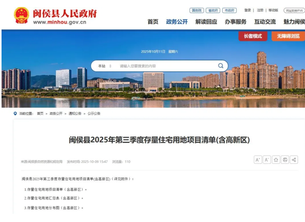 2025年10月9日,闽侯县自然资源和规划局发布“闽侯县2025年第三季度存量住宅用地项目清单(含高新区) ”。