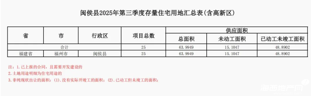 闽侯县2025年第三季度存量住宅用地汇总表(含高新区)显示,项目共有25个,总面积63.9949公顷(折合959.92亩),未动工面积15.1047公顷,已劝工未竣工面积48.8902公顷。