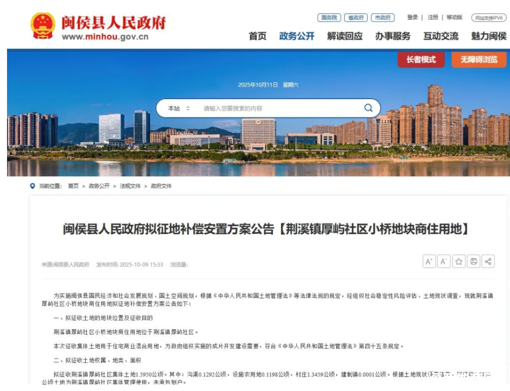 2025年10月4日,闽侯县人民政府发布“拟征地补偿安置方案公告【荆溪镇厚屿社区小桥地块商住用地】 ”。