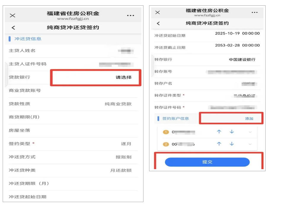 ③选择“贷款银行”——填写“商业贷款账号”——“签约账户信息”点击“添加”公积金账户(有补贴户需重复此步骤)——账户添加完毕确认无误,点击“提交”