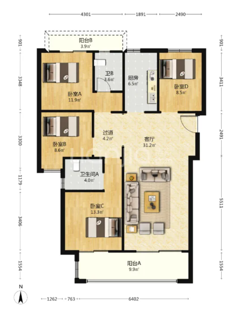 130㎡做到4房+南北双阳台;