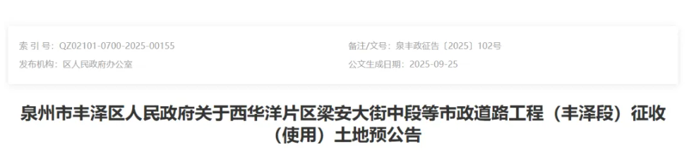 为实施泉州市丰泽区国民经济和社会发展规划、泉州市国土空间规划,根据《中华人民共和国土地管理法》等法律法规的规定,现发布西华洋片区梁安大街中段等市政道路工程(丰泽段)征收(使用)土地预公告: