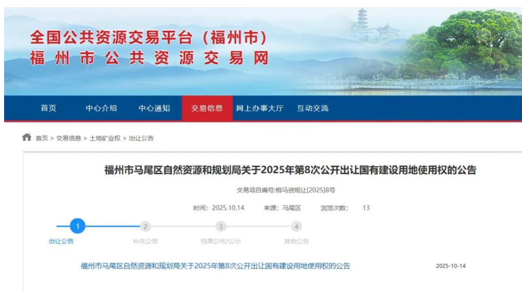 2025年10月14日,福州市马尾区自然资源和规划局发布“关于2025年第8次公开出让国有建设用地使用权的公告”。