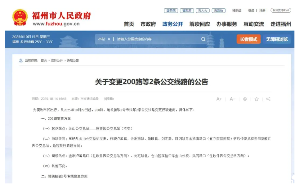 2025年10月14日,福州市道路运输事业发展中心发布“关于变更200路等2条公交线路的公告 ”。