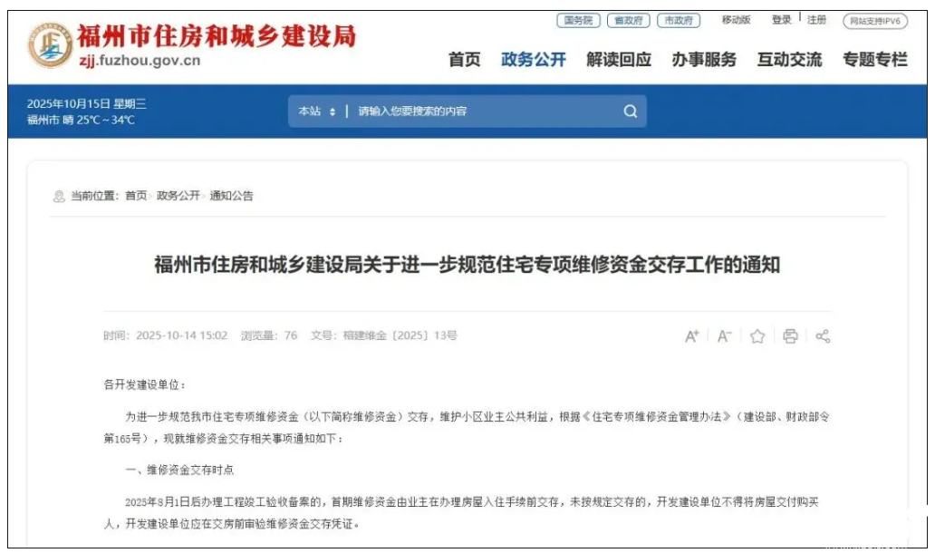 2025年10月14日,福州市住房和城乡建设局官网发布“关于进一步规范住宅专项维修资金交存工作的通知”。
