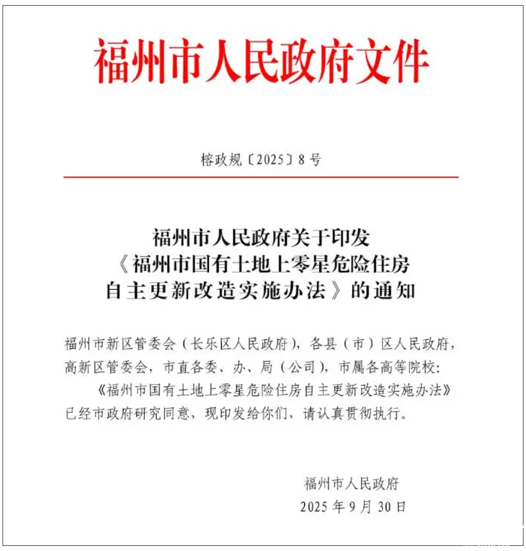 海西房产网(微信公众号:fjhxfcw)消息:2025年9月30日,福州市人民政府发布“关于印发《福州市国有土地上零星危险住房自主更新改造实施办法》的通知 ”。