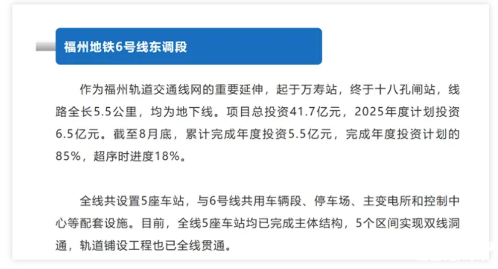 地铁6号线东调段工程项目总投资41.7亿元,2025年度计划投资6.5亿元。截至8月底,累计完成年度投资5.5亿元,完成年度投资计划的85%,超序时进度18%。