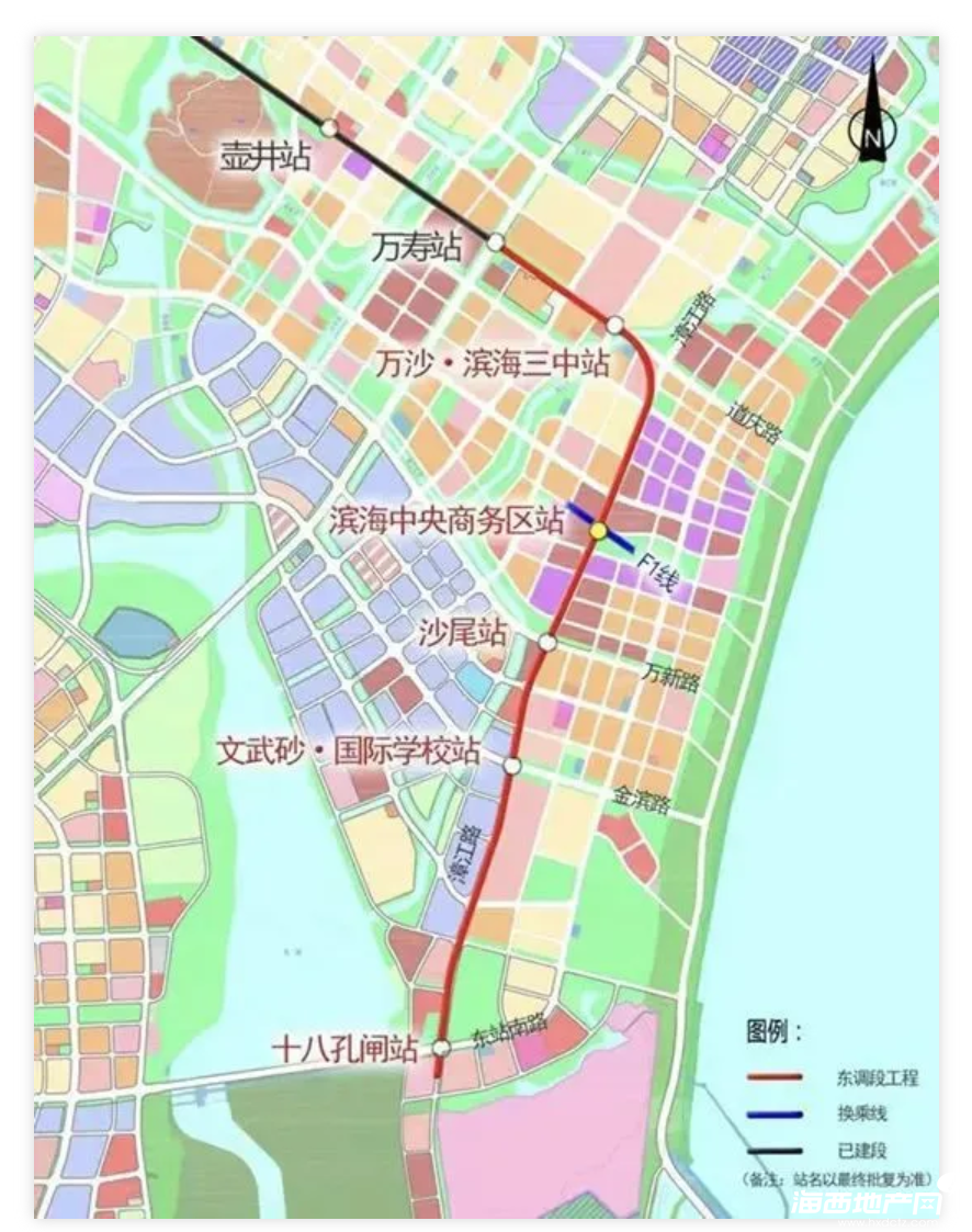 福州地铁6号线东调段作为福州轨道交通线网的重要延伸,起始于6号线一期终点站万寿站,终止于长乐滨海新城的十八孔闸站,线路单线全长约5.55千米,共设置5座车站,分别为万沙·滨海三中站、滨海中央商务区站、沙尾站、文武砂·国际学校站、十八孔闸站。