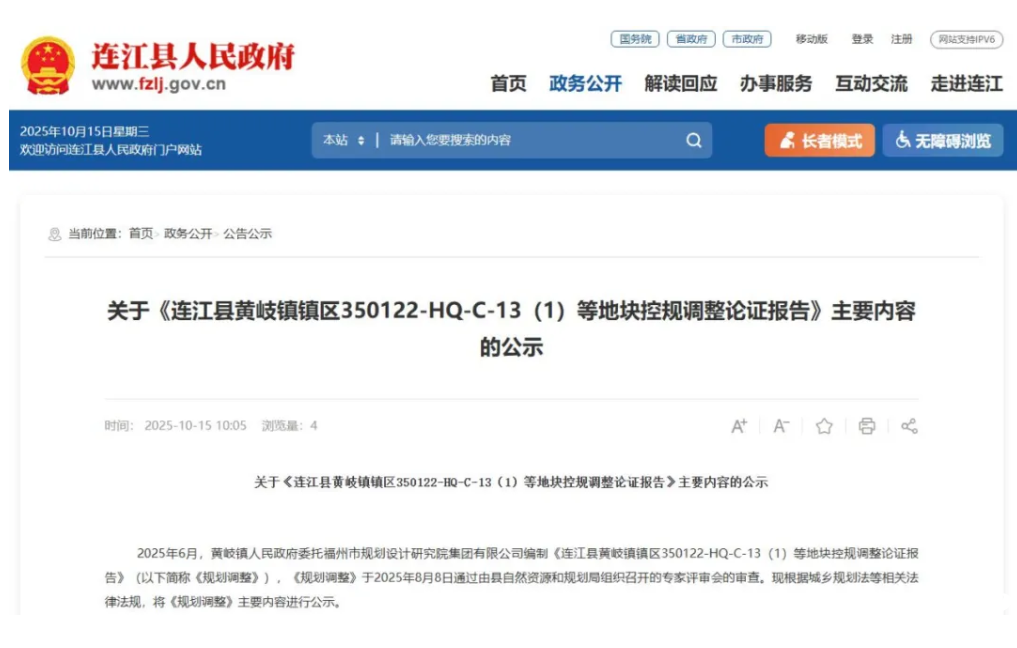 2025年10月14日,连江县黄岐镇人民政府发布了关于《连江县黄岐镇镇区350122-HQ-C-13(1)等地块控规调整论证报告》主要内容的公示。