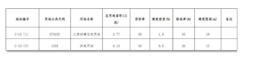 地块编号C-13(1),用地分类代码070102,用地名称二类城镇住宅用地,总用地面积0.77公顷,容积率30,建筑密度1.8%,绿地率35%,建筑限高18米。