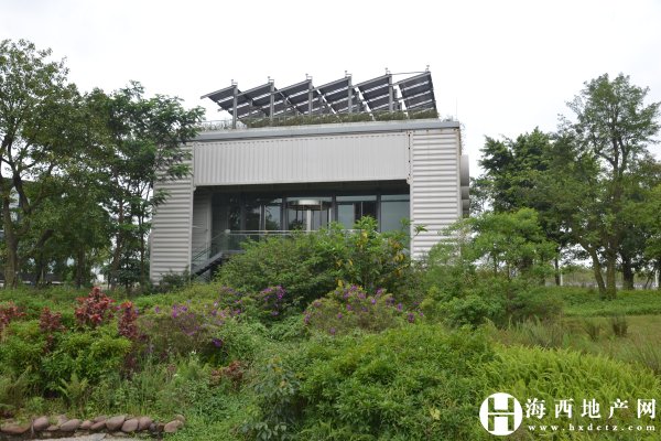 进入建研中心大门,就可以看到一座白色的房子,外形方正且时尚。讲解员介绍到,这是用废弃的集装箱建成的房子,在2011年5月,开始做为建研中心的食堂使用。此外,这种集装箱房屋,还通过各种技术尽可能实现节能,楼顶植有草皮,起到降温的效果,还使用太阳能空调、太阳能热水器来节省资源。房屋旁边还种植了花草,用绿色植物来调节气候。下一步,建研中心还打算用废弃的集装箱建一个员工宿舍。