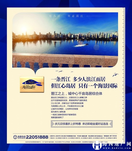 (海西地产网12月28日报道)海景国际项目庆元旦惊喜折上折特惠,来访即砸金蛋好运连连。一条晋江,多少人滨江而居,但江心岛居,只有一个海景国际!
