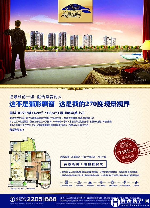 (海西地产网3月21日报道)把最好的一切,献给挚爱的人。海景国际星域3B#/5#楼142㎡-166㎡江景现房完美上市,3B#301压轴新品折后7181元/㎡起。成熟岛镇,江景阔宅,超大中庭泳池,方正户型。