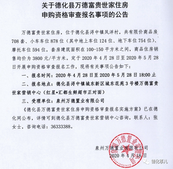 关于德化县万德富贵世家住房申购资格审查报名事项的公告 | 泉州万德置业有限公司