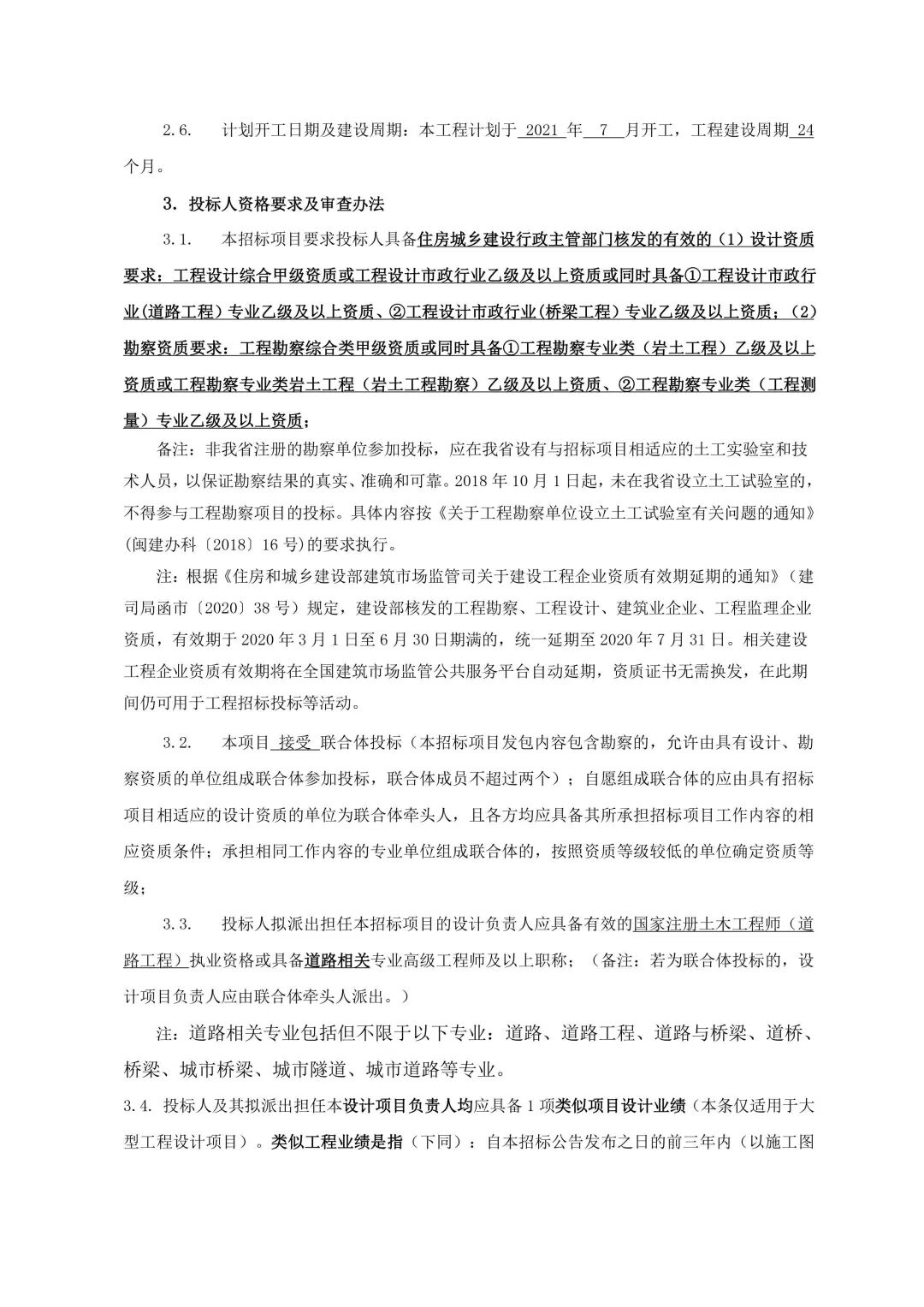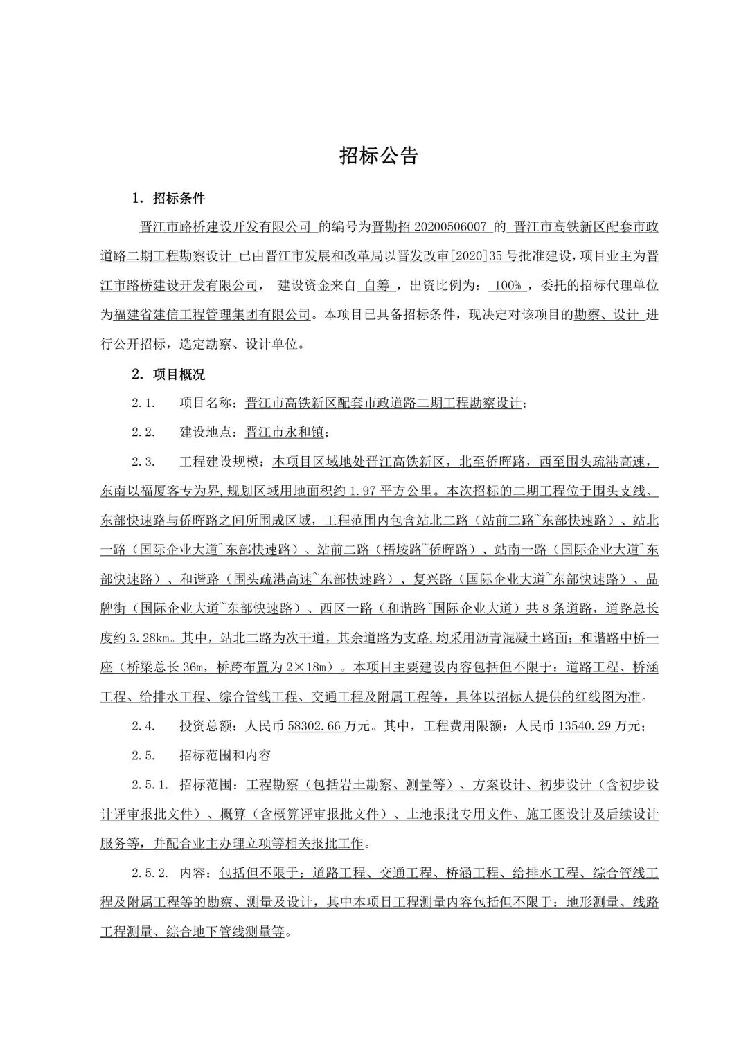 晋江市路桥建设开发有限公司的编号为晋勘招20200506007的晋江市高铁新区配套市政道路二期工程勘察设计已由晋江市发展和改革局以晋发改审[2020]35号批准建设,项目业主为晋江市路桥建设开发有限公司,建设资金来自自筹,出资比例为:100%,委托的招标代理单位为福建省建信工程管理集团有限公司。本项目已具备招标条件,现决定对该项目的勘察、设计 进行公开招标,选定勘察、设计单位。