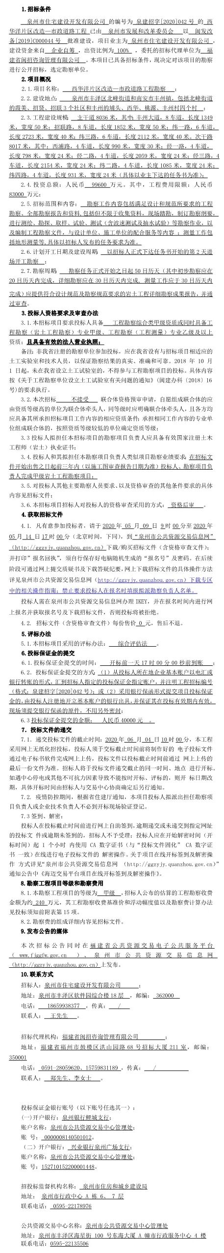 泉州市住宅建设开发有限公司的编号为泉建招字[2020]042号的西华洋片区改造—市政道路工程已由泉州市发展和改革委员会以闽发改备[2019]C000044号批准建设,项目业主为泉州市住宅建设开发有限公司,建设资金来自企业自筹,出资比例为100%,委托的招标代理单位为福建省闽招咨询管理有限公司。本项目已具备招标条件,现决定对该项目的勘察进行公开招标,选定勘察单位。