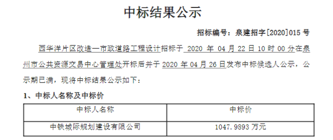 5月8日,泉州公共资源交易信息网发布西华洋片区改造—市政道路工程设计中标公告,中铁城际规划建设有限公司中标。