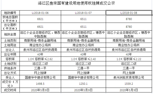 泉州洲拓贸易有限公司以1559.2万元竞得LJ2018-01-08号地块,楼面价为799.93元/㎡。