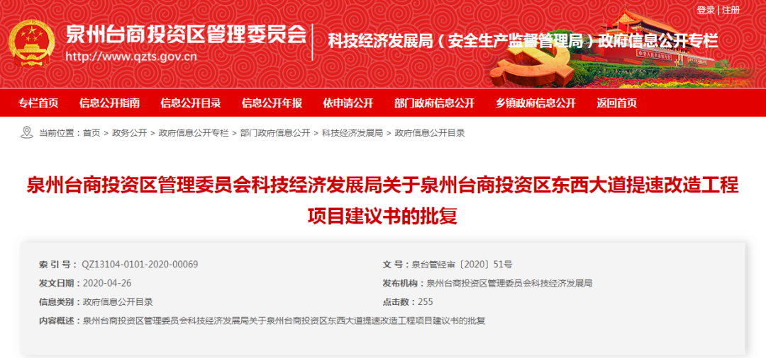 4月26日,台商区科技经济发展局发布了《关于泉州台商投资区东西大道提速改造工程项目建议书的批复》。