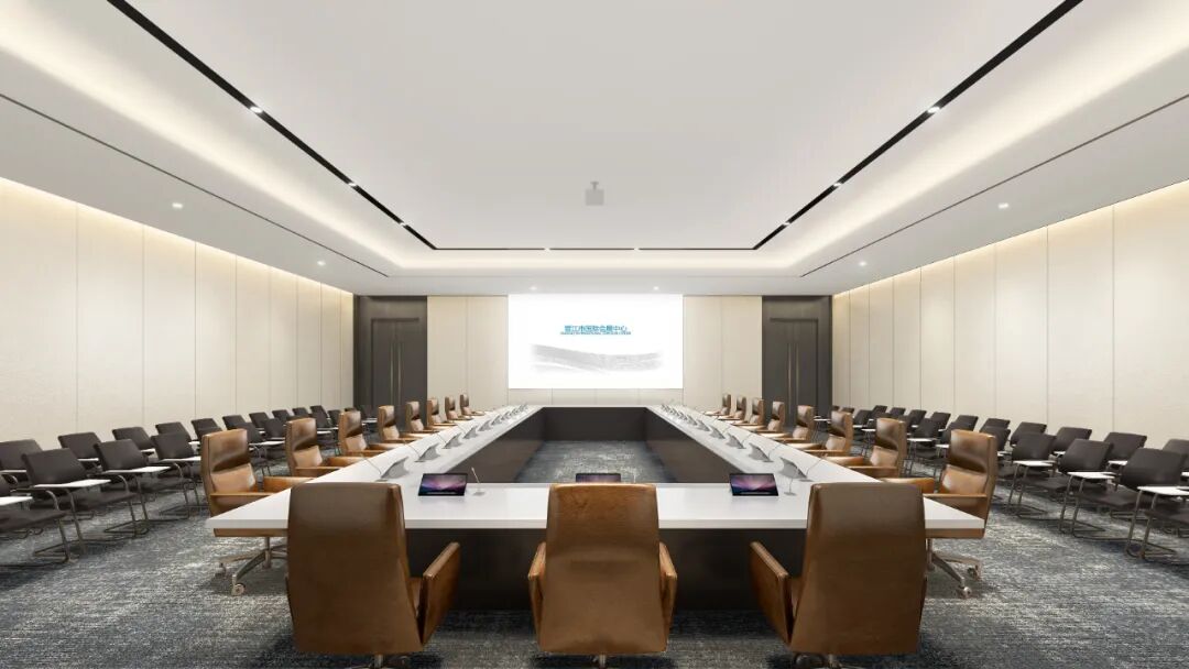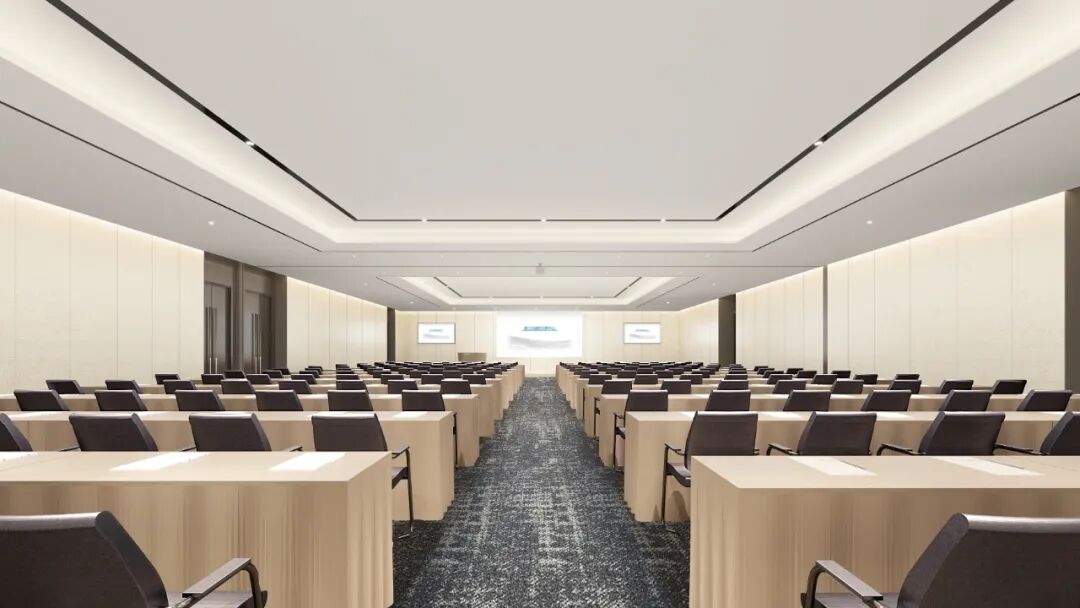 会议中心整体两层,地上建筑面积约1万平米,首层会议室净空高度4米,可容纳400人,会议室可以分隔成四间独立会议室。